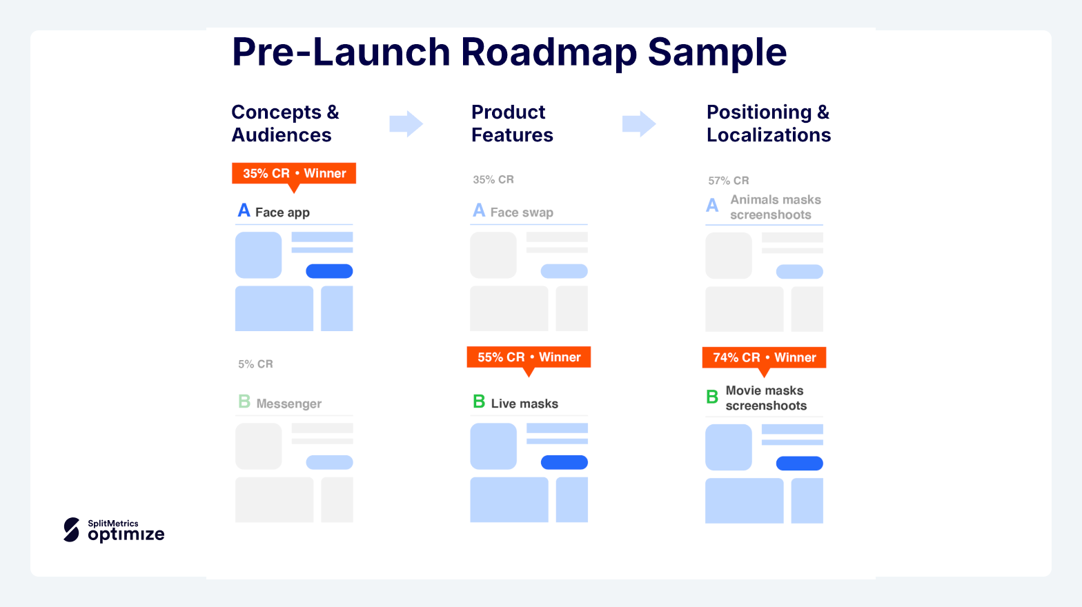 Pre-launch A/B testing can begin before development starts, allowing you to find the right creative direction or sample the market. The sequential A/B/n testing methodology is frequently utilized during this stage, as it allows to create a logical progression of experiments that build on each other.