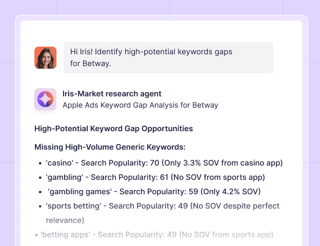 Your AI agent for Apple Ads & ASO — spot brand bidders, expand high-value generics with geo-specific suggestions, and get ROI-backed actions (in Slack) in seconds.